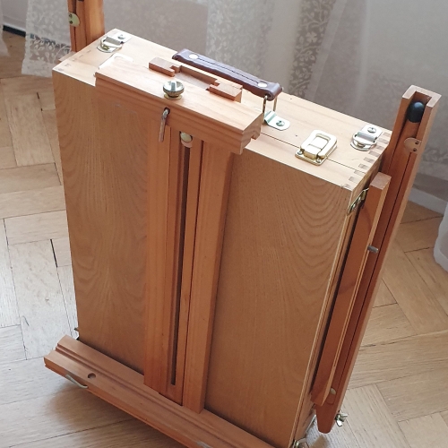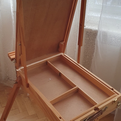 V podstatě nový skládací malířský stojan s přihrádkou na barvy, štětce, ad.